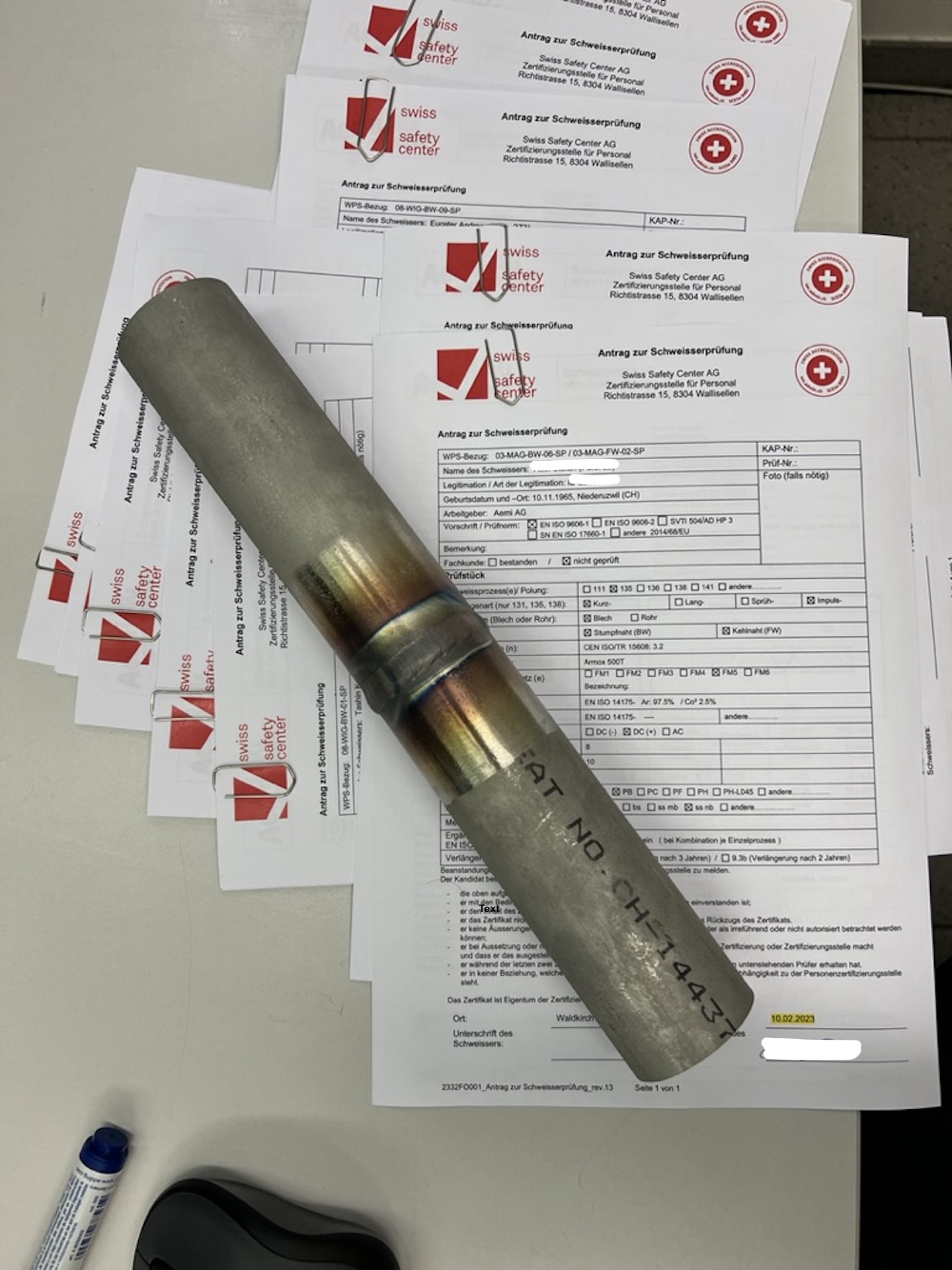 - Abnahme und Qualifizierung von Schweisser und Verfahrensprüfung DIN EN ISO 15614 & Schweisserprüfung nach DIN EN ISO 9606) die Zertifizierung erfolgt durch Swiss Safety Center AG