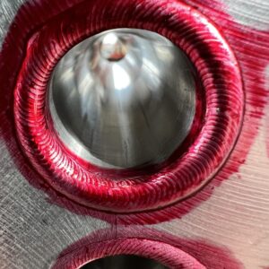 Farbeindringprüfung PT: Eine effektive Methode zur Detektion von Oberflächenrissen und anderen Diskontinuitäten in nicht-porösen Materialien. Ein farbiges Eindringmittel wird auf die Oberfläche aufgetragen, das in Oberflächenfehler eindringt. Nach dem Entfernen des überschüssigen Eindringmittels wird ein Entwickler aufgetragen, der verbliebene Eindringmittel aus den Fehlern hervorhebt, wodurch diese sichtbar werden.